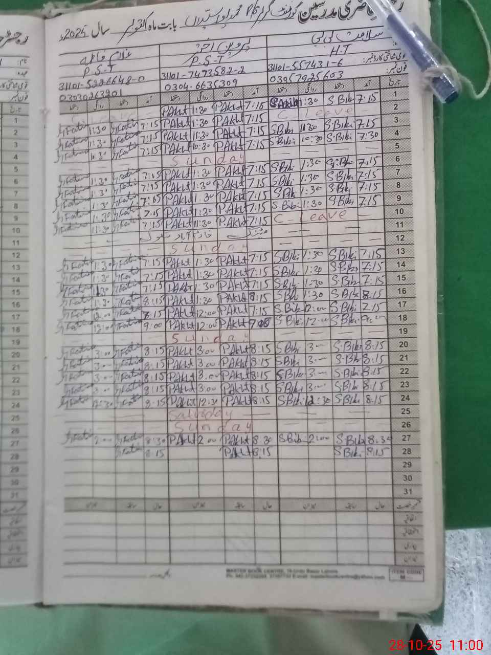 | Leave | Duty | Absent | Maternity | Medical | Ex- Pak |