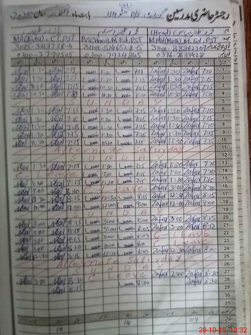 | CNIC | Full Name | Designation | R/C | Absence During Last Calender Month |