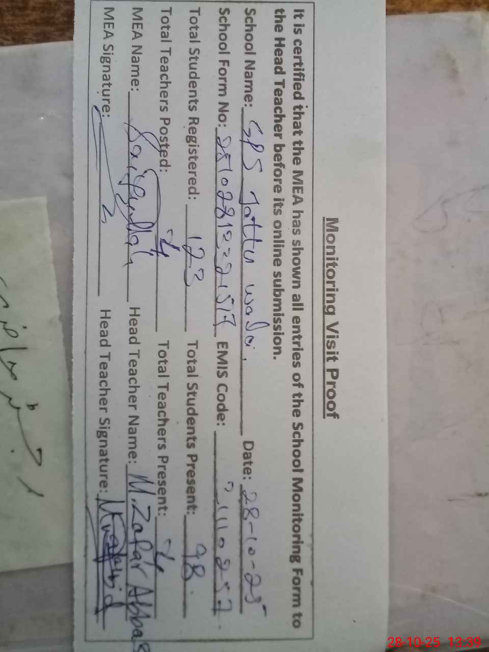 | Attendance Register | Head Teacher | MEA with School | Visit Proof |