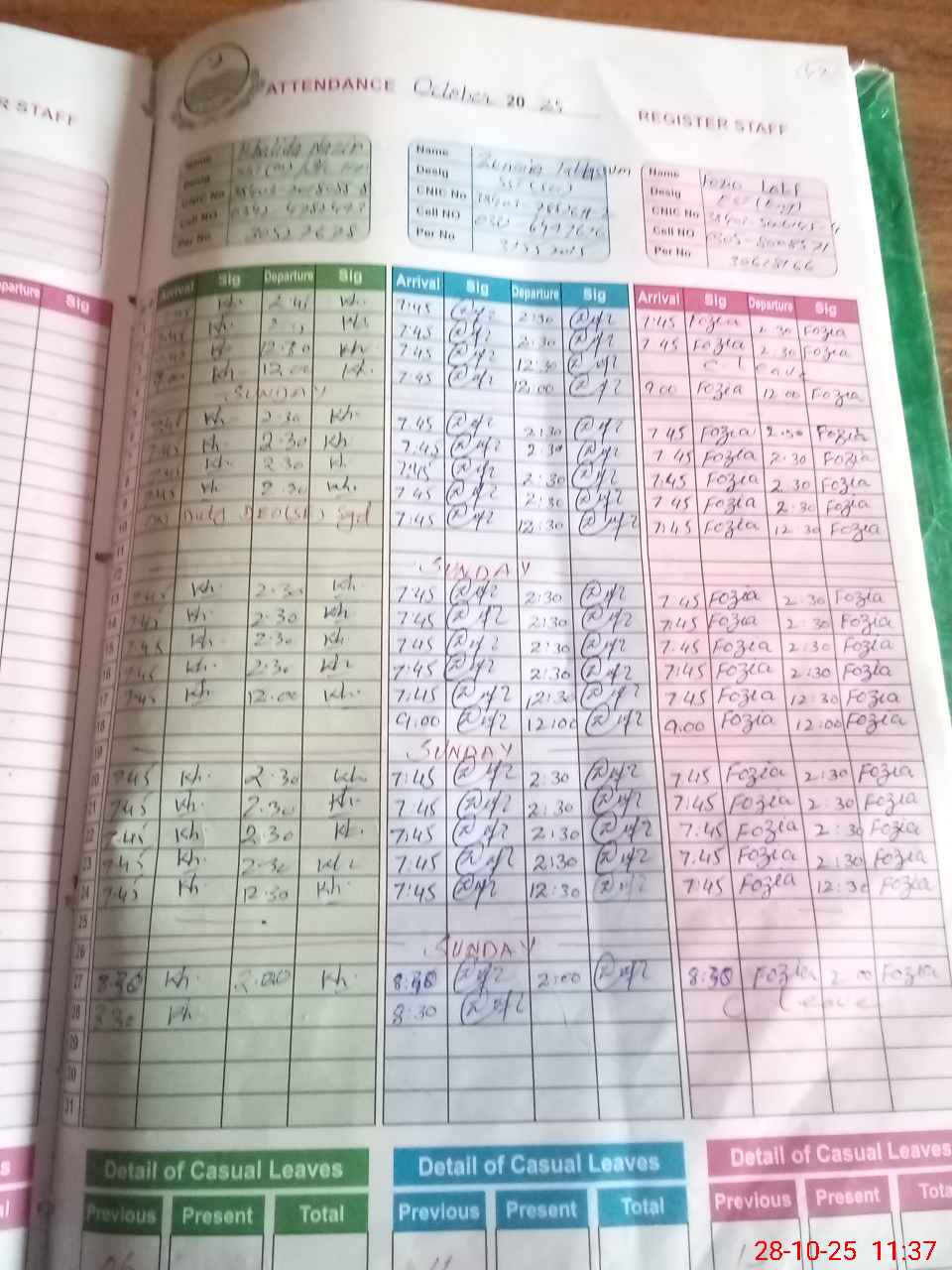 | CNIC | Full Name | Designation | R/C | Absence during last cal. month |