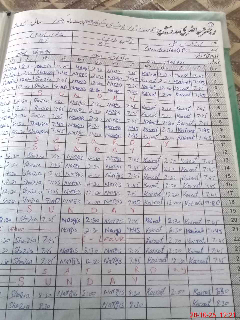 | CNIC | Full Name | Designation | R/C | Absence During Last Calender Month |
