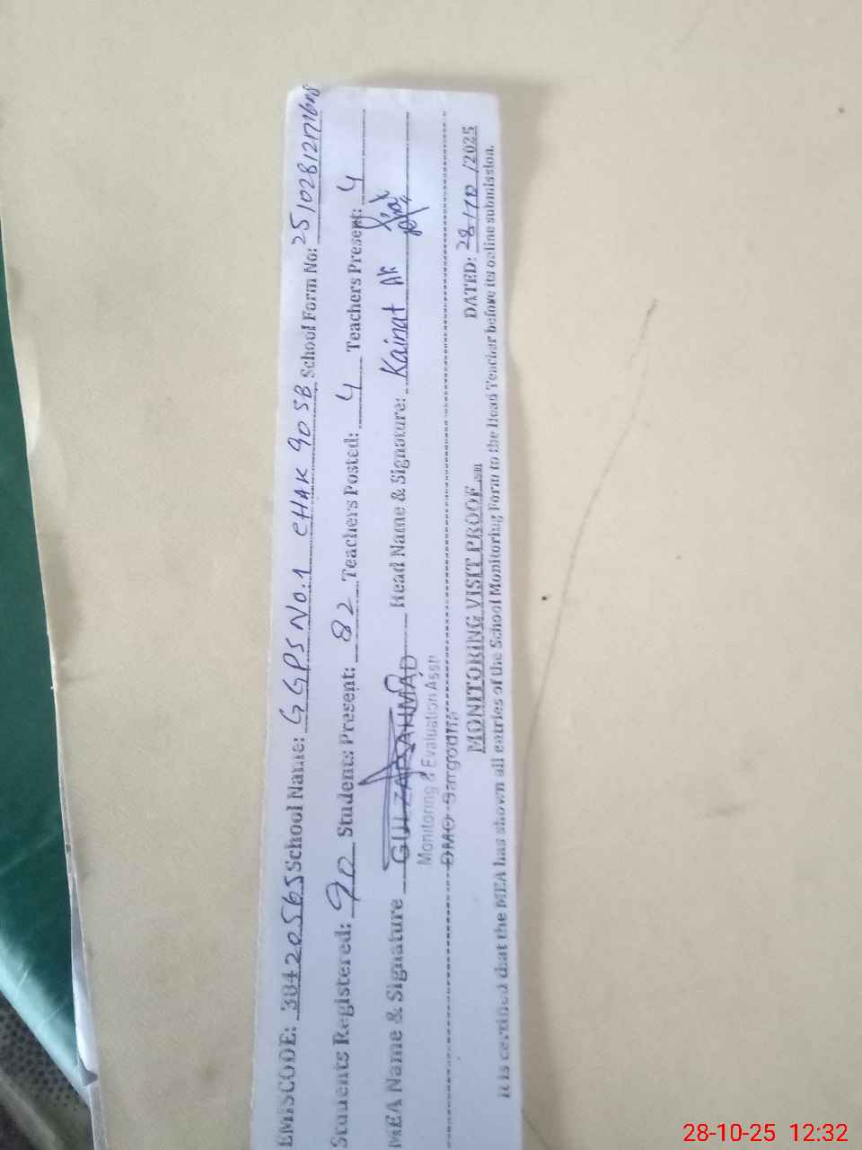 | Attendance Register | Head Teacher | MEA with School | Visit Proof |