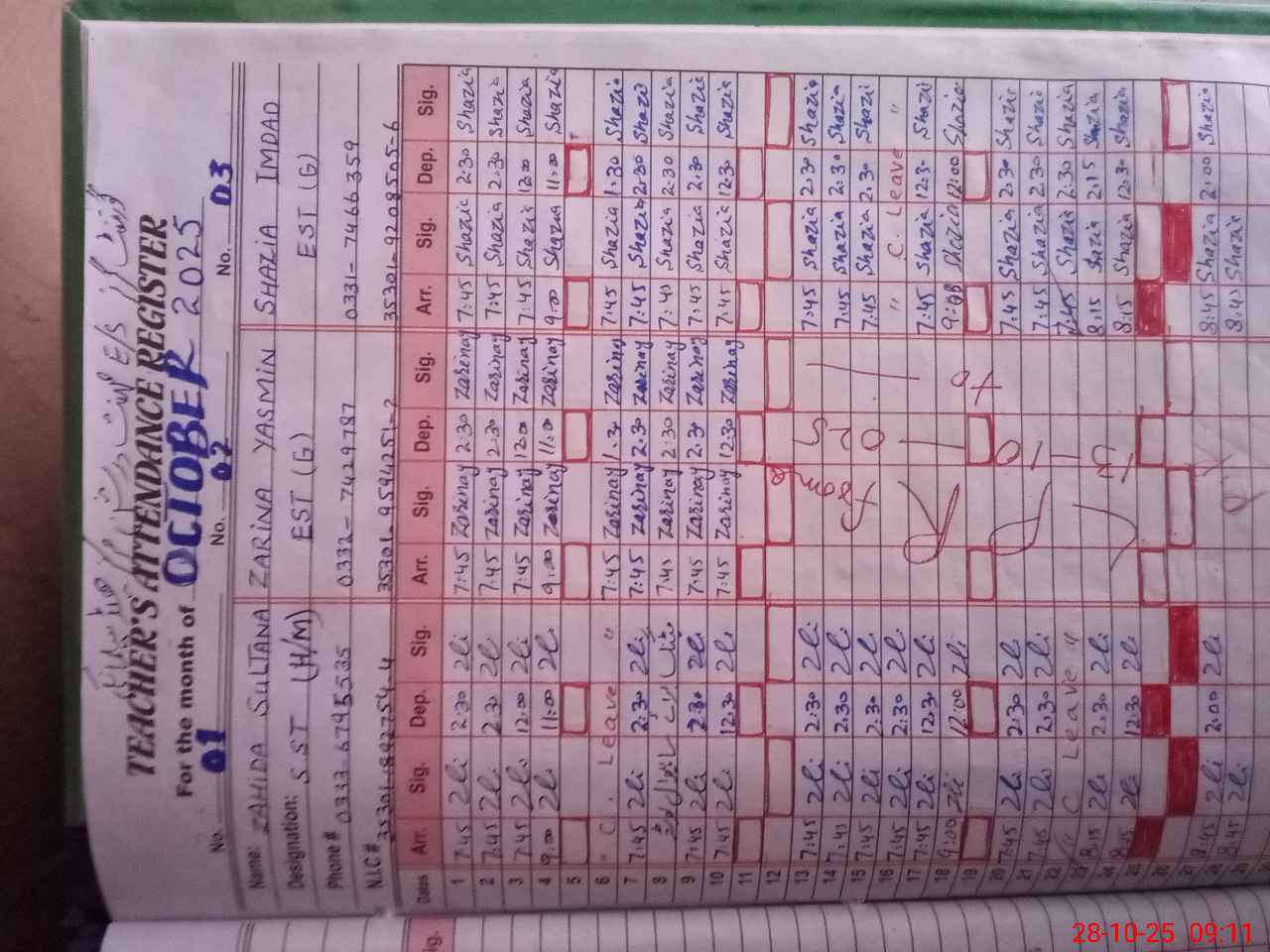 | Name: ZA**** SU**** Designation: (School Headmaster's/Headmistress's) SST GEN Phone/Cell Number: 03**** |