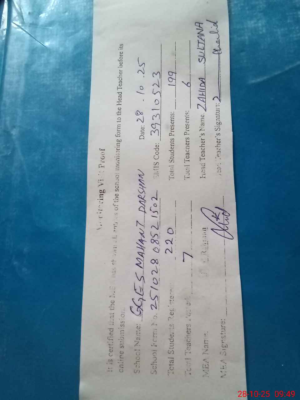 | Attendance Register | Head Teacher | MEA with School | Visit Proof |