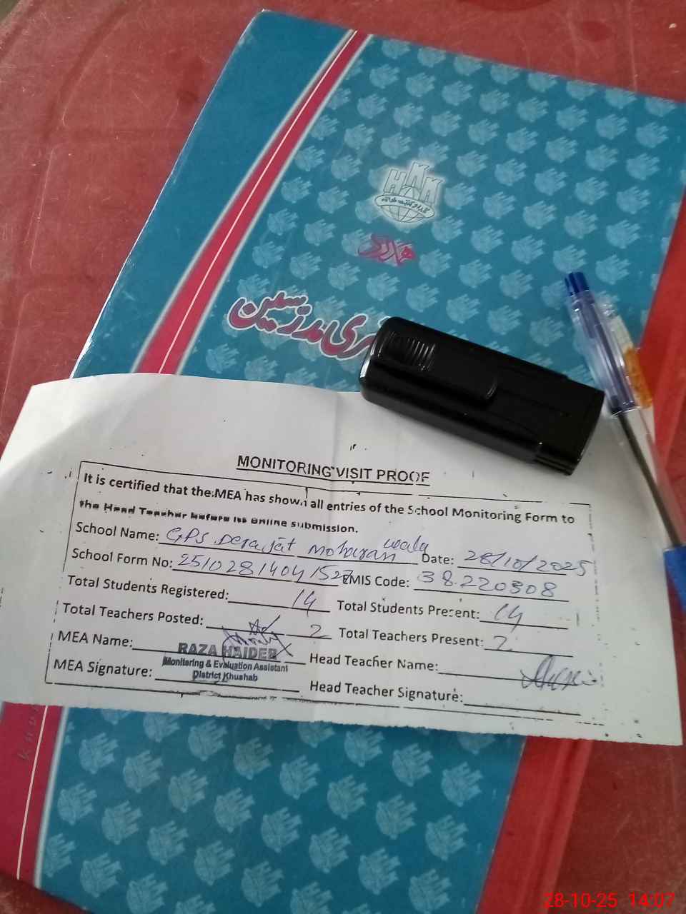 | Attendance Register | Head Teacher | MEA with School | Visit Proof |