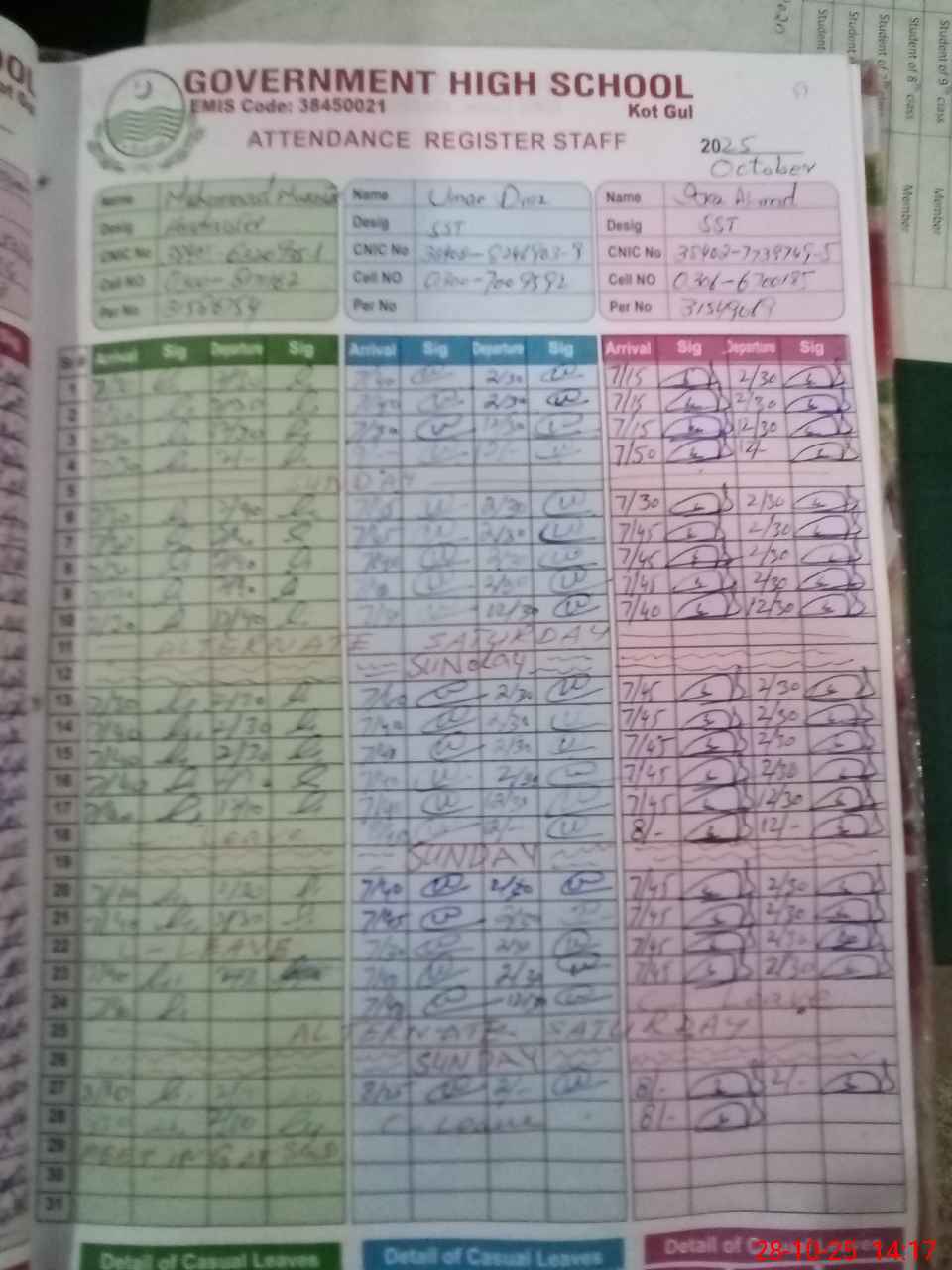 | CNIC | Full Name | Designation | R/C | Absence during last cal. month |