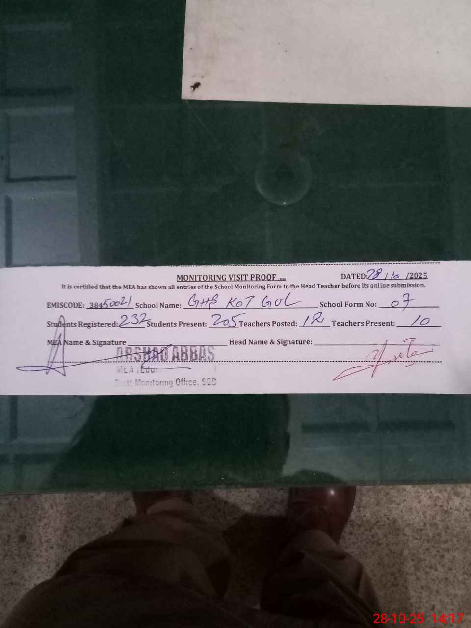 | Attendance Register | Head Teacher | MEA with School | Visit Proof |
