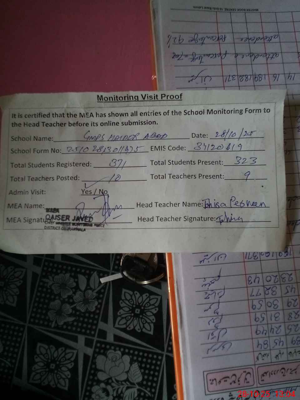 | Attendance Register | Head Teacher | MEA with School | Visit Proof |