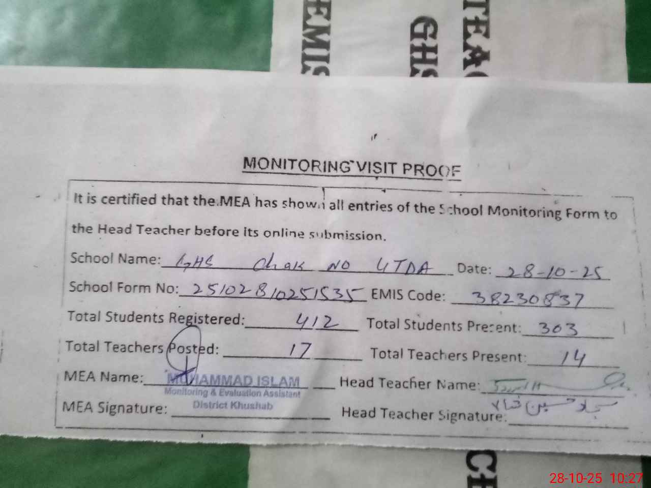 | EMIS Code: 38230837 | Name of School: GHS CHAK NO. 4 TDA | |||