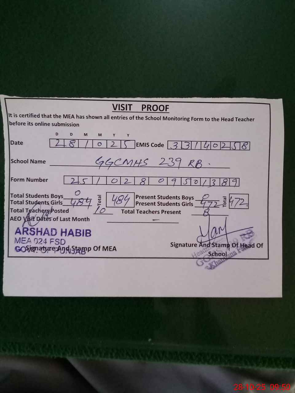 | EMIS Code: 33140258 | Name of School: GGCMHS CHAK NO. 239 RB | |||