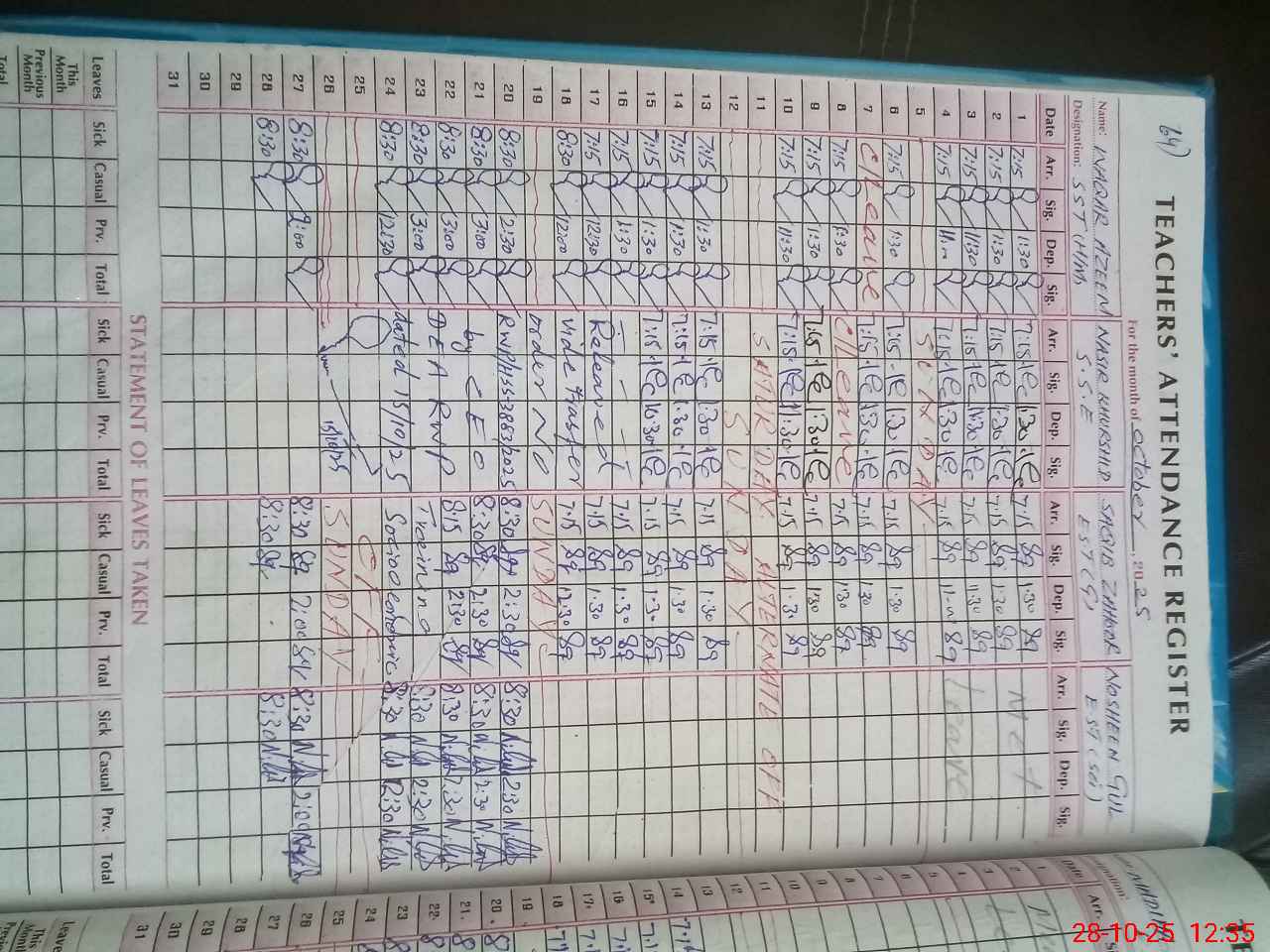 | CNIC | Full Name | Designation | R/C | Absence During Last Calender Month |