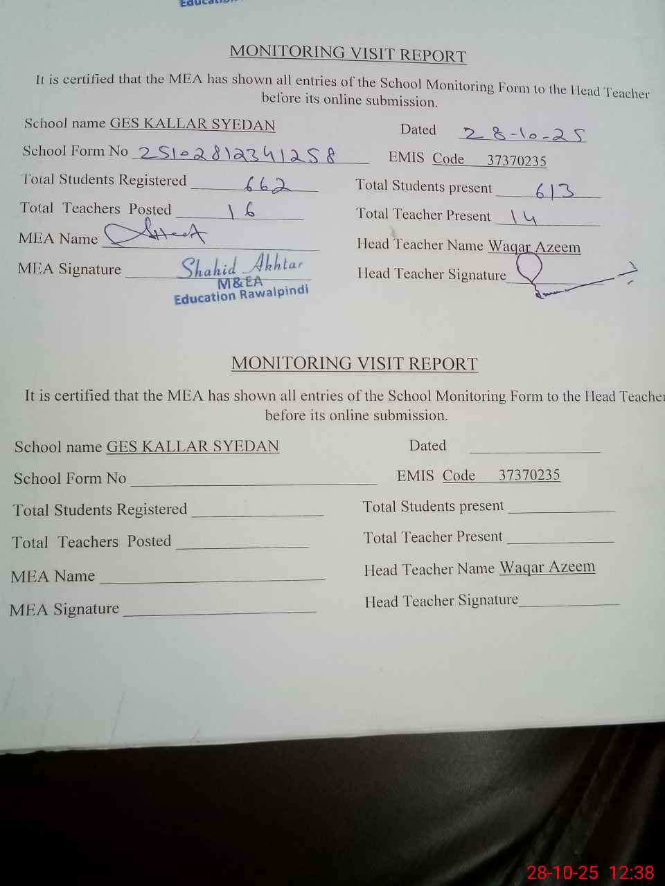 | Attendance Register | Head Teacher | MEA with School | Visit Proof |