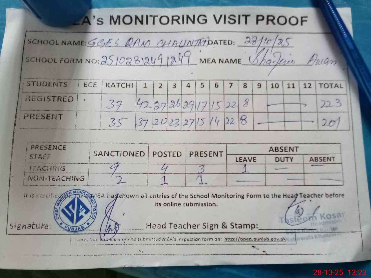 | Attendance Register | Head Teacher | MEA with School | Visit Proof |
