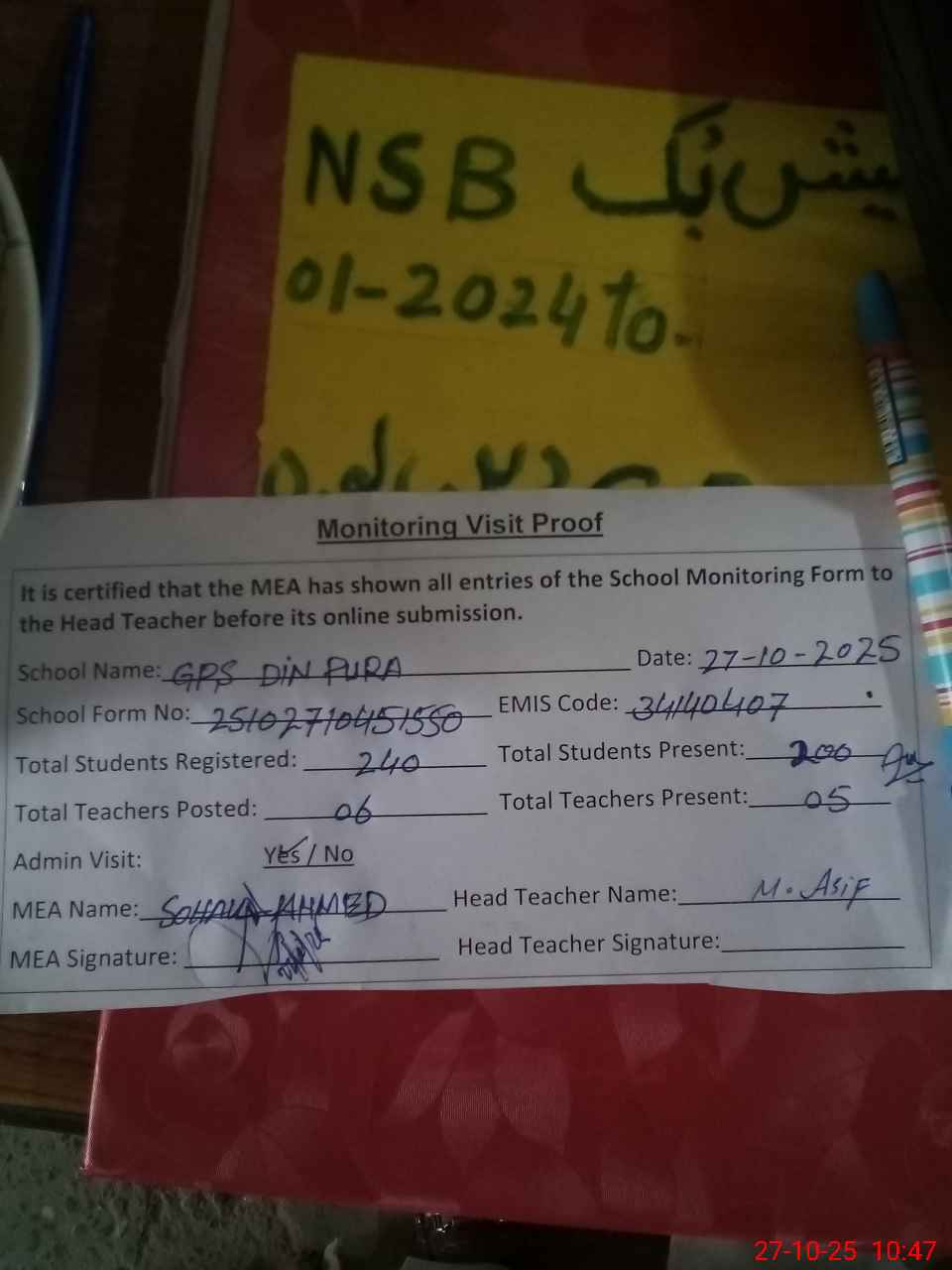 | Monitoring Date: 27-10-2025 | Start Time: 27-10-2025 10:20 AM | End Time: 27-10-2025 10:47 AM | Name of MEA: N-**** Ah**** | |
