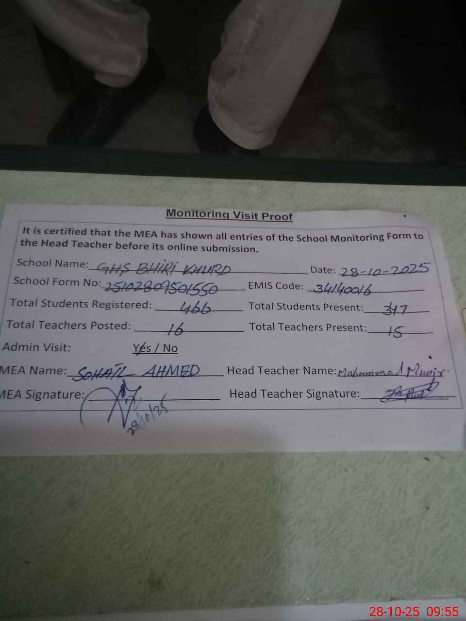 | Monitoring Date: 28-10-2025 | Start Time: 28-10-2025 08:58 AM | End Time: 28-10-2025 09:55 AM | Name of MEA: N-**** Ah**** | |