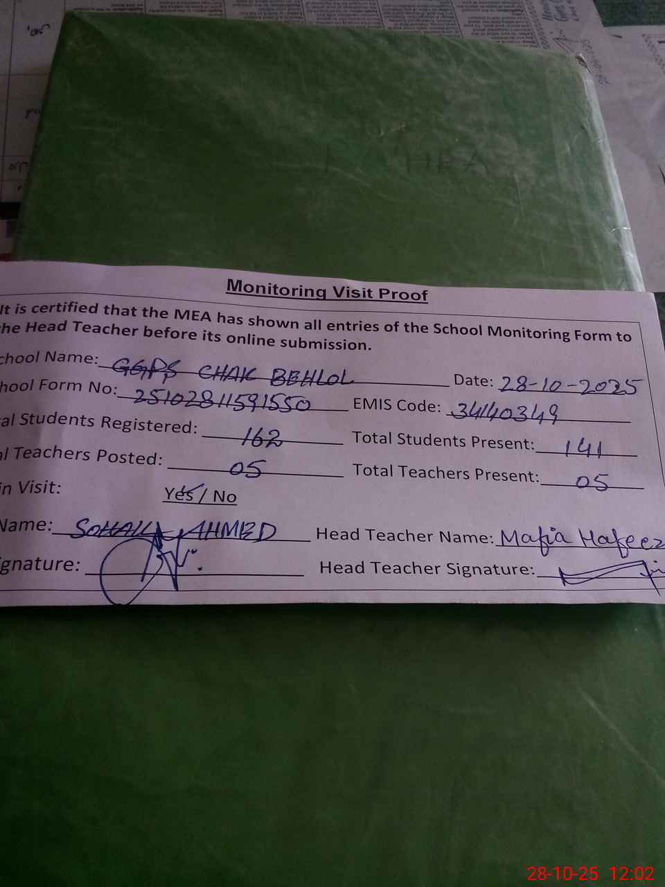 | Attendance Register | Head Teacher | MEA with School | Visit Proof |