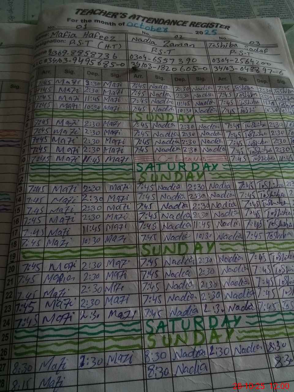 | CNIC | Full Name | Designation | R/C | Absence during last cal. month |