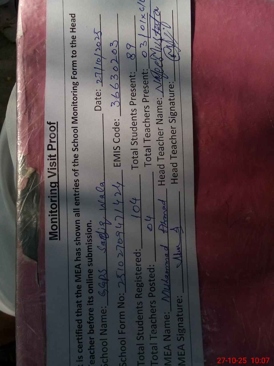 | EMIS Code: 36630203 | Name of School: GGPS SADIQ WALAL | |||