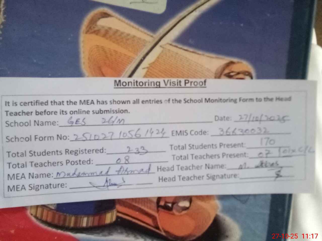| Attendance Register | Head Teacher | MEA with School | Visit Proof |