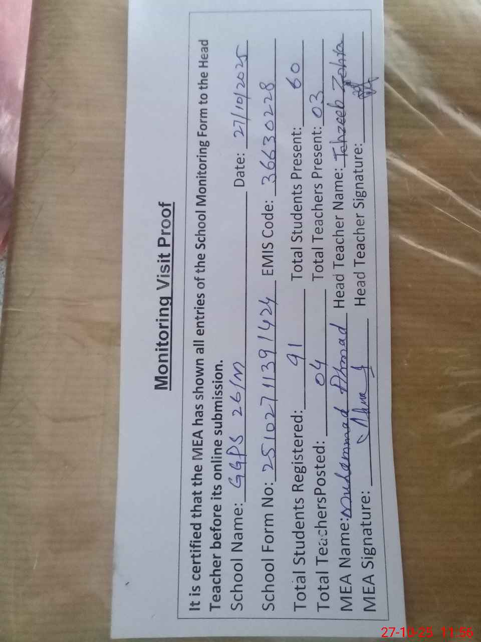 | Attendance Register | Head Teacher | MEA with School | Visit Proof |