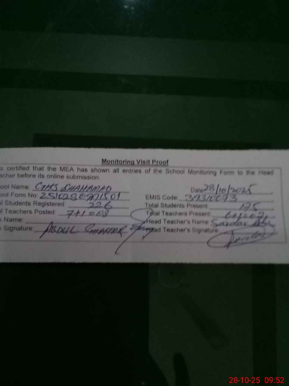 | Remarks (Use Separate Page if Required): 01 teacher named Ghulam Farid EST is permanently posted at GHS Shahamad since 27 Oct 2025 however his name is not enter in the pmiu monitoring software | |||||