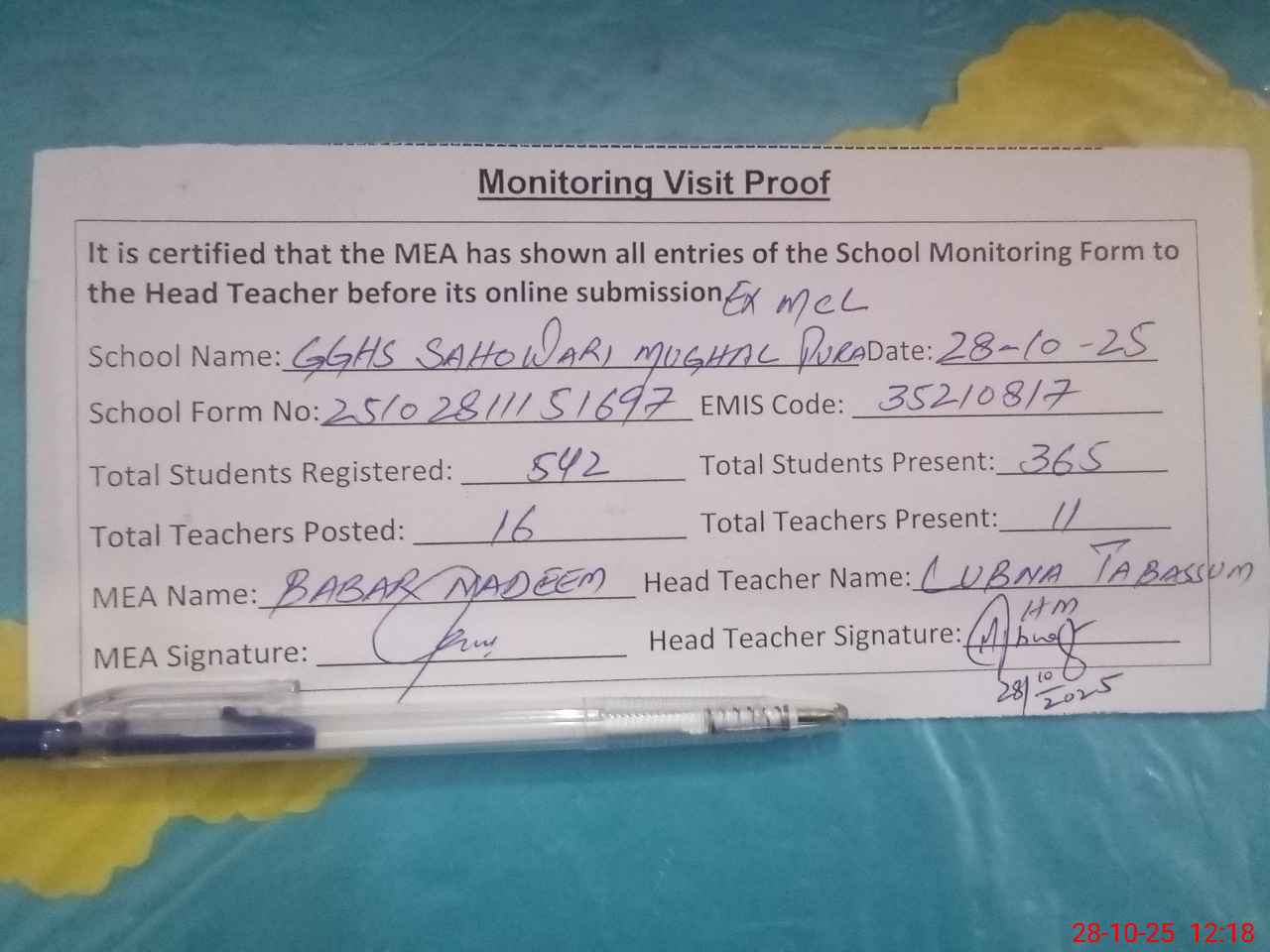 | Attendance Register | Head Teacher | MEA with School | Visit Proof |