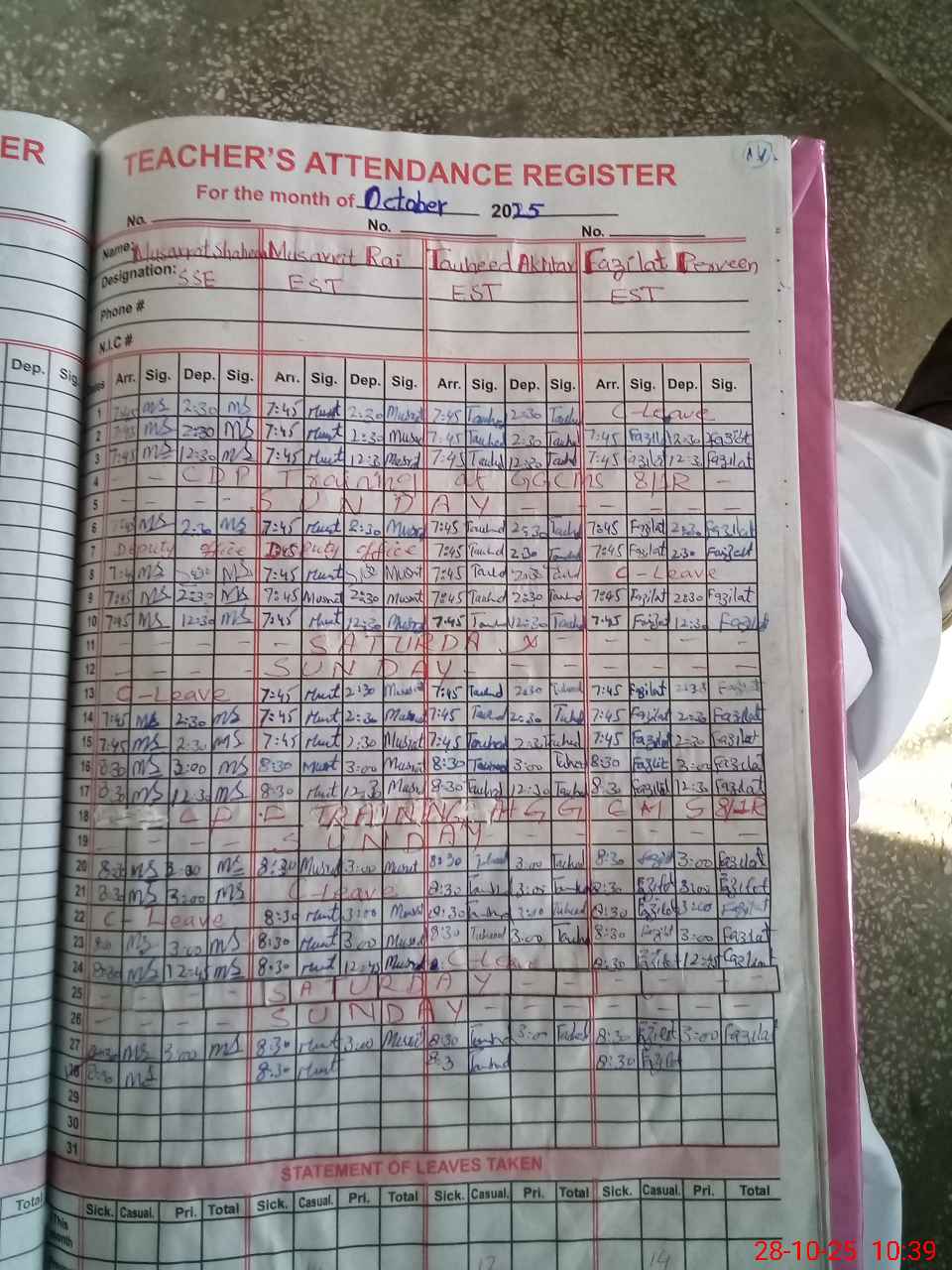 | Leave | Duty | Absent | Maternity | Medical | Ex- Pak |
