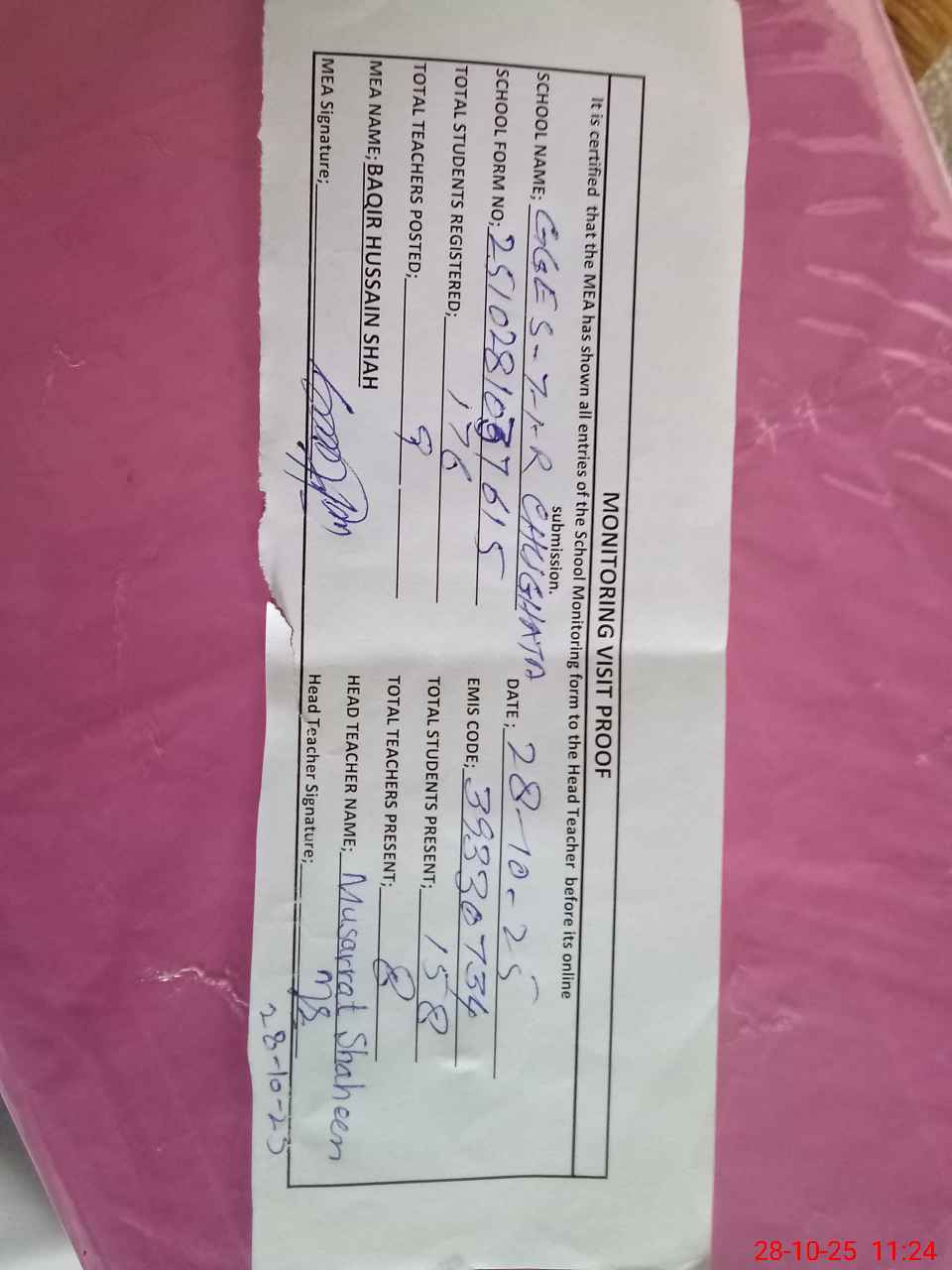 | Attendance Register | Head Teacher | MEA with School | Visit Proof |
