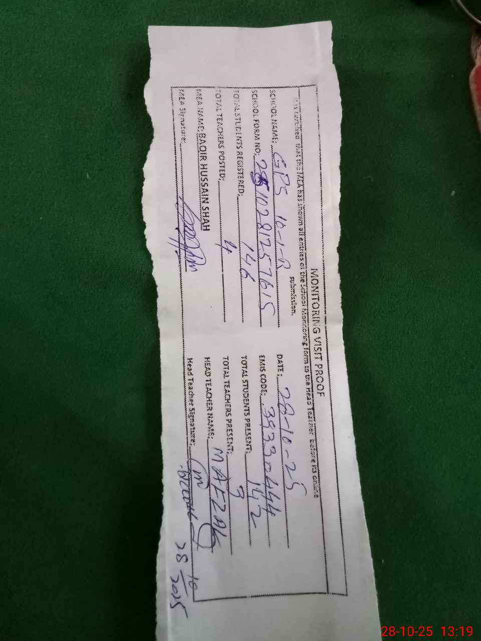 | Attendance Register | Head Teacher | MEA with School | Visit Proof |