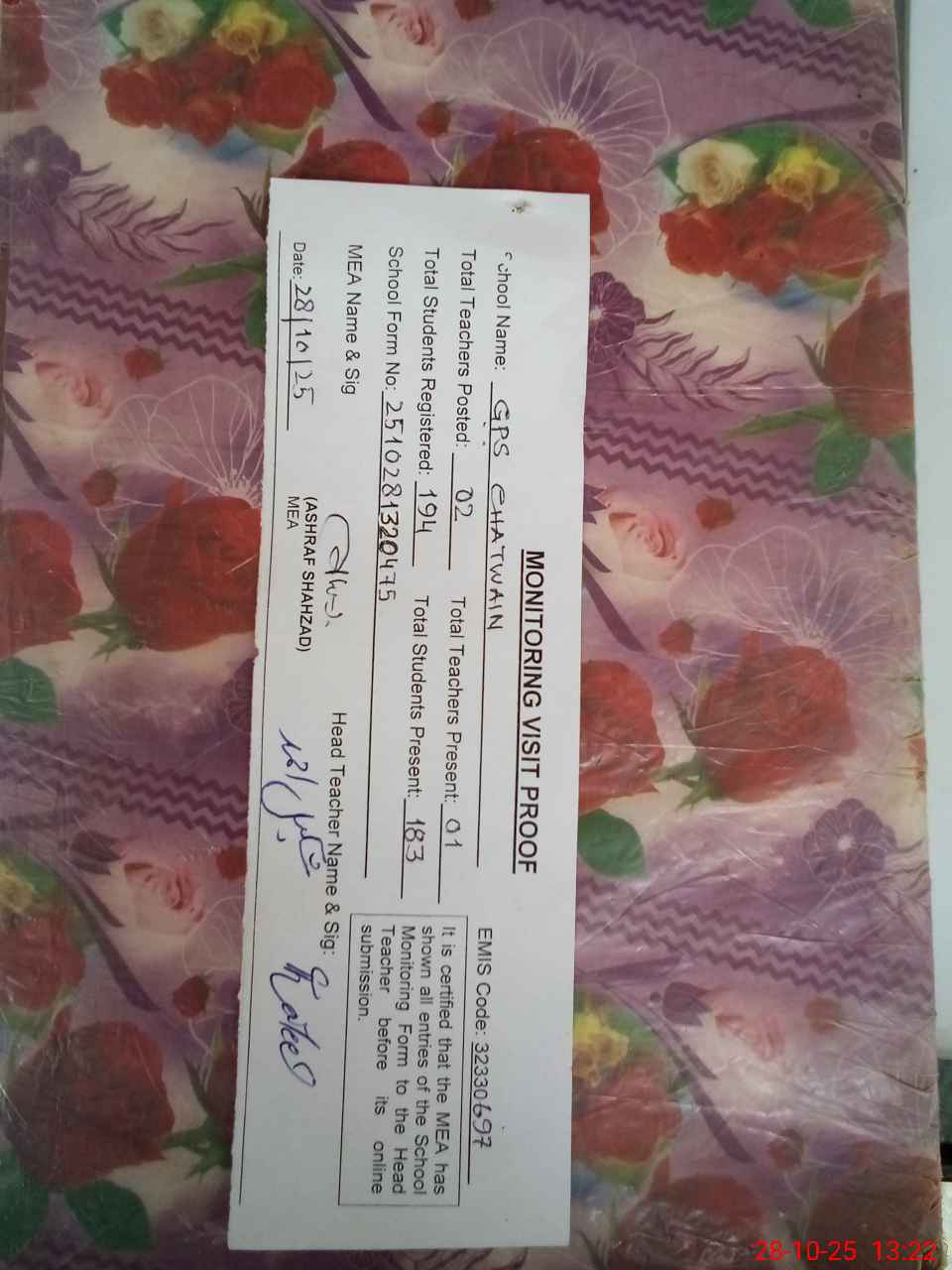 | Attendance Register | Head Teacher | MEA with School | Visit Proof |