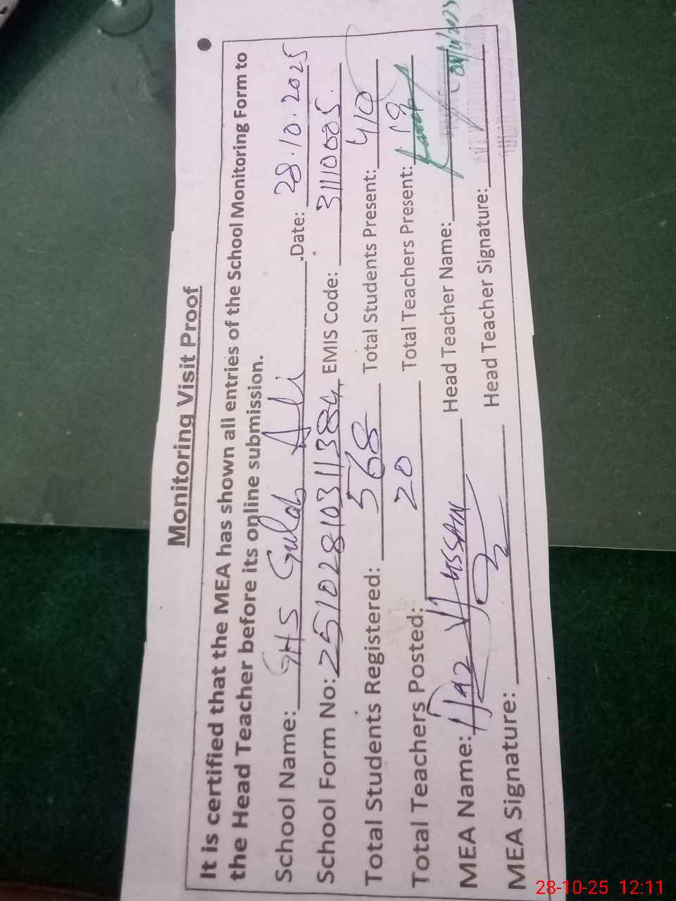| Attendance Register | Head Teacher | MEA with School | Visit Proof |