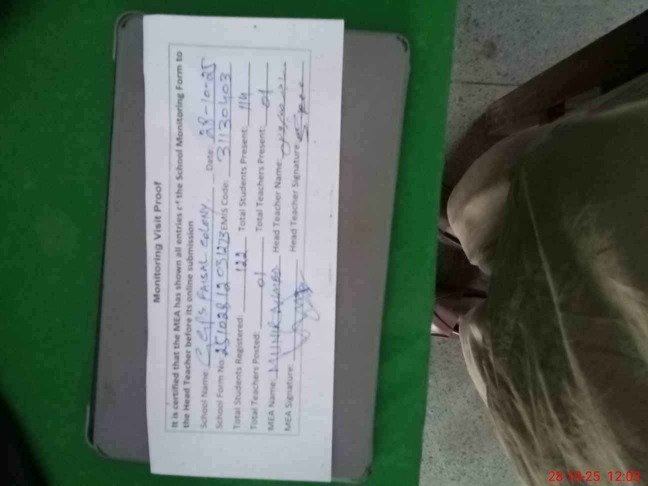 | Attendance Register | Head Teacher | MEA with School | Visit Proof |