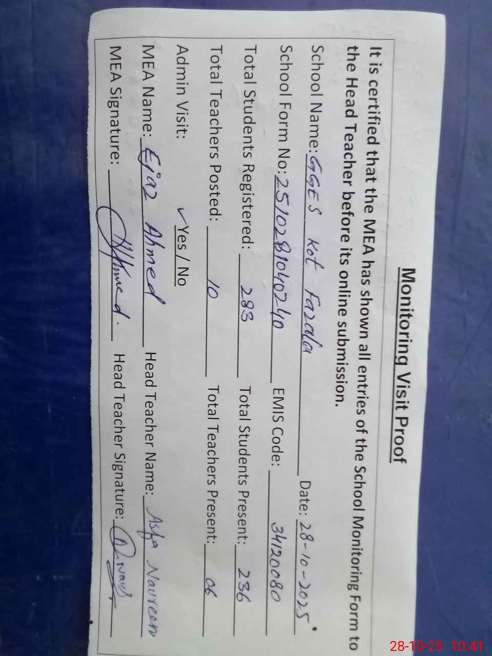 | EMIS Code: 34120080 | Name of School: GGES KOT FAZLA | |||