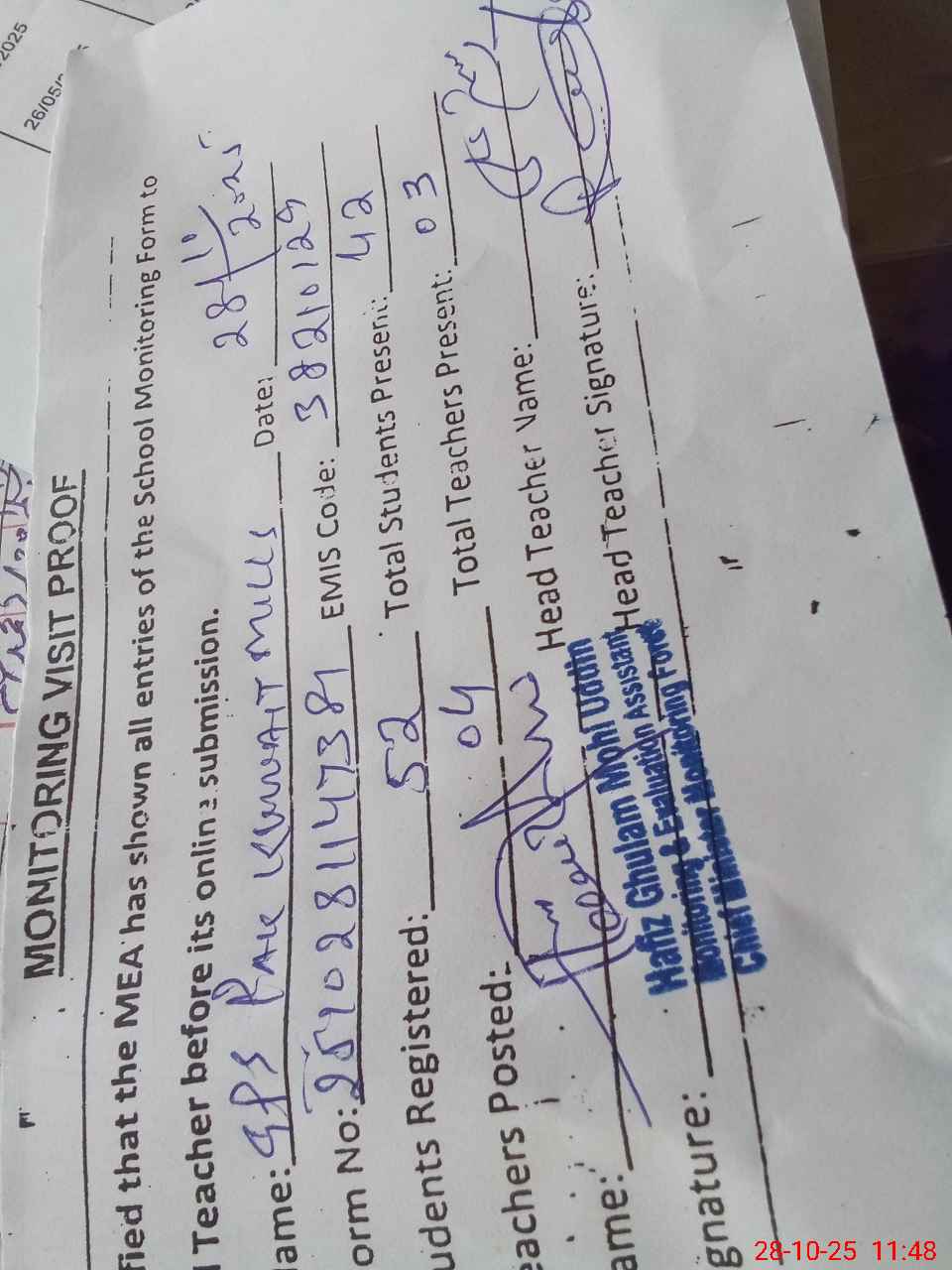 | Attendance Register | Head Teacher | MEA with School | Visit Proof |