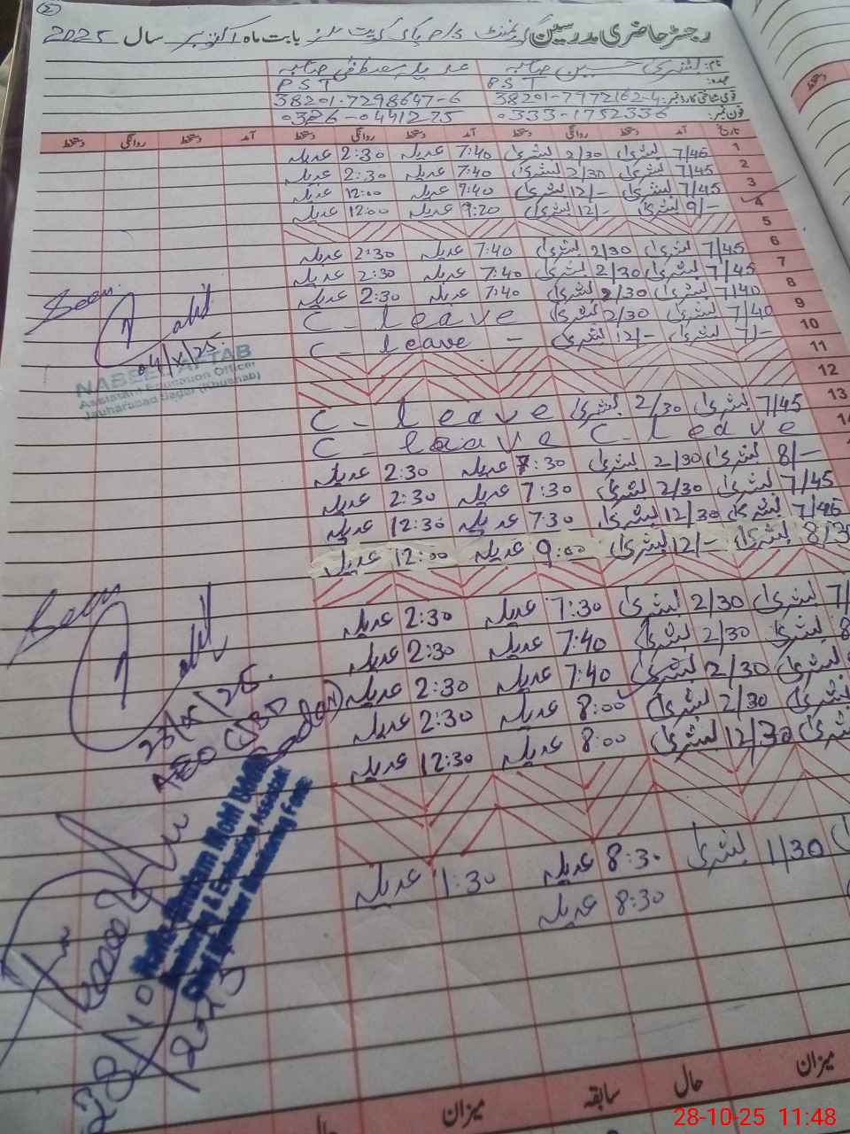| CNIC | Full Name | Designation | R/C | Absence During Last Calender Month |