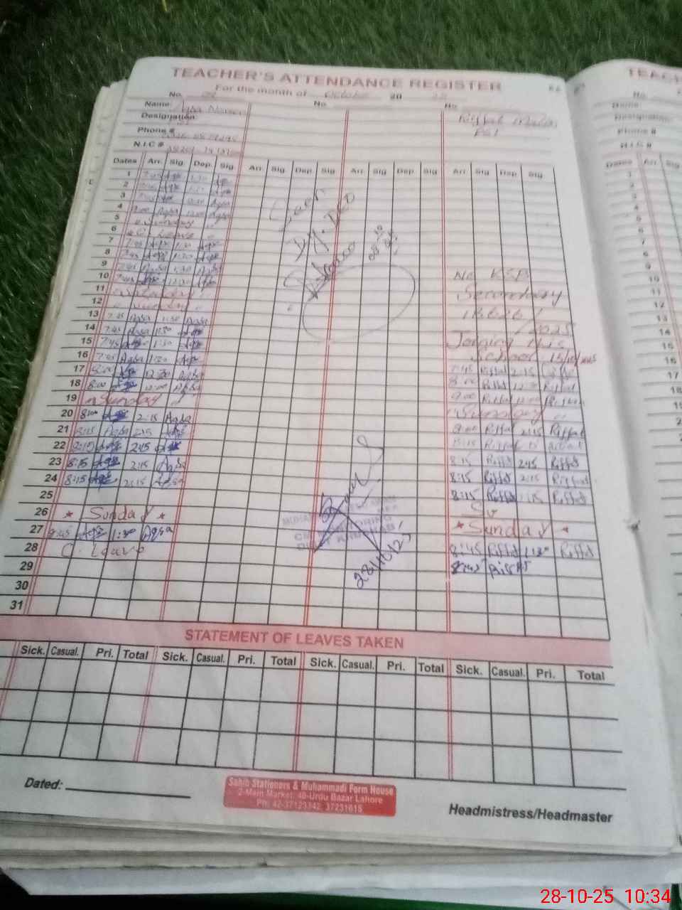 | CNIC | Full Name | Designation | R/C | Absence During Last Calender Month |