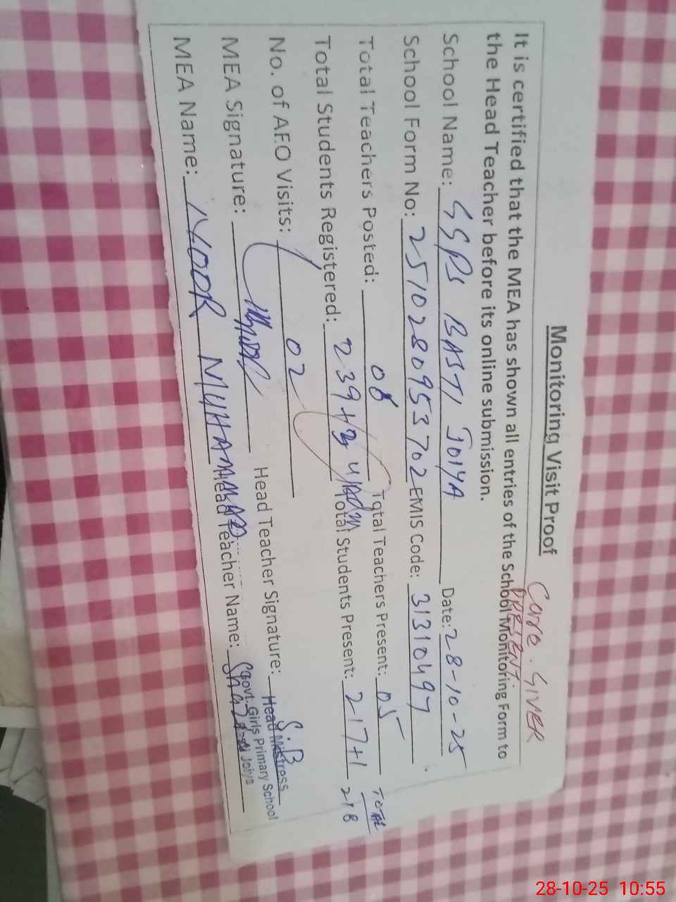 | Attendance Register | Head Teacher | MEA with School | Visit Proof |