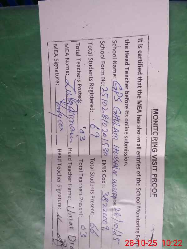 | EMIS Code: 38220009 | Name of School: GPS GHULAM HUSSAIN WALA | |||