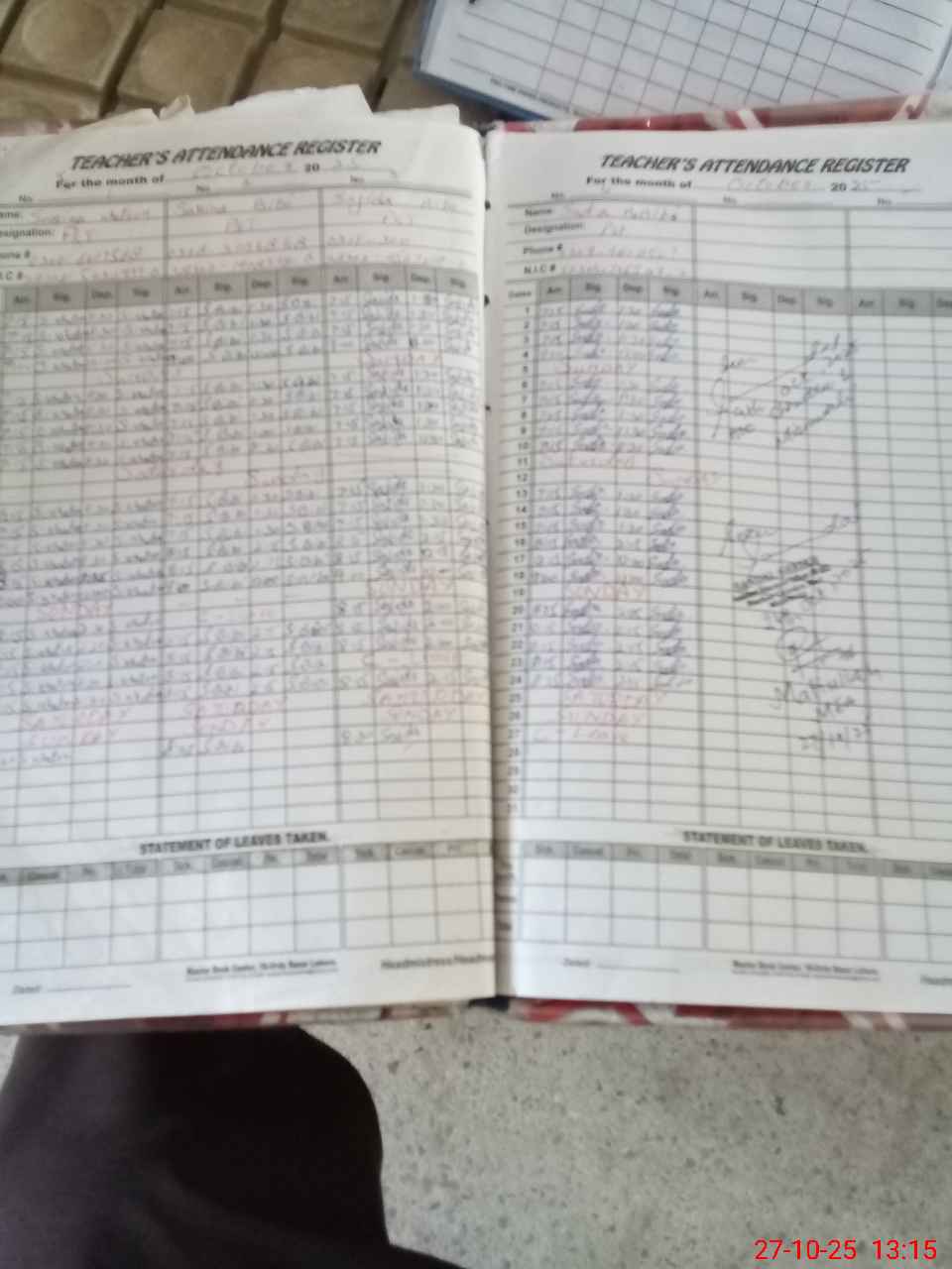 | Remarks (Use Separate Page if Required): PST Sadia Habib approved leave not available with Head teacher stamina Khatoon | |||||