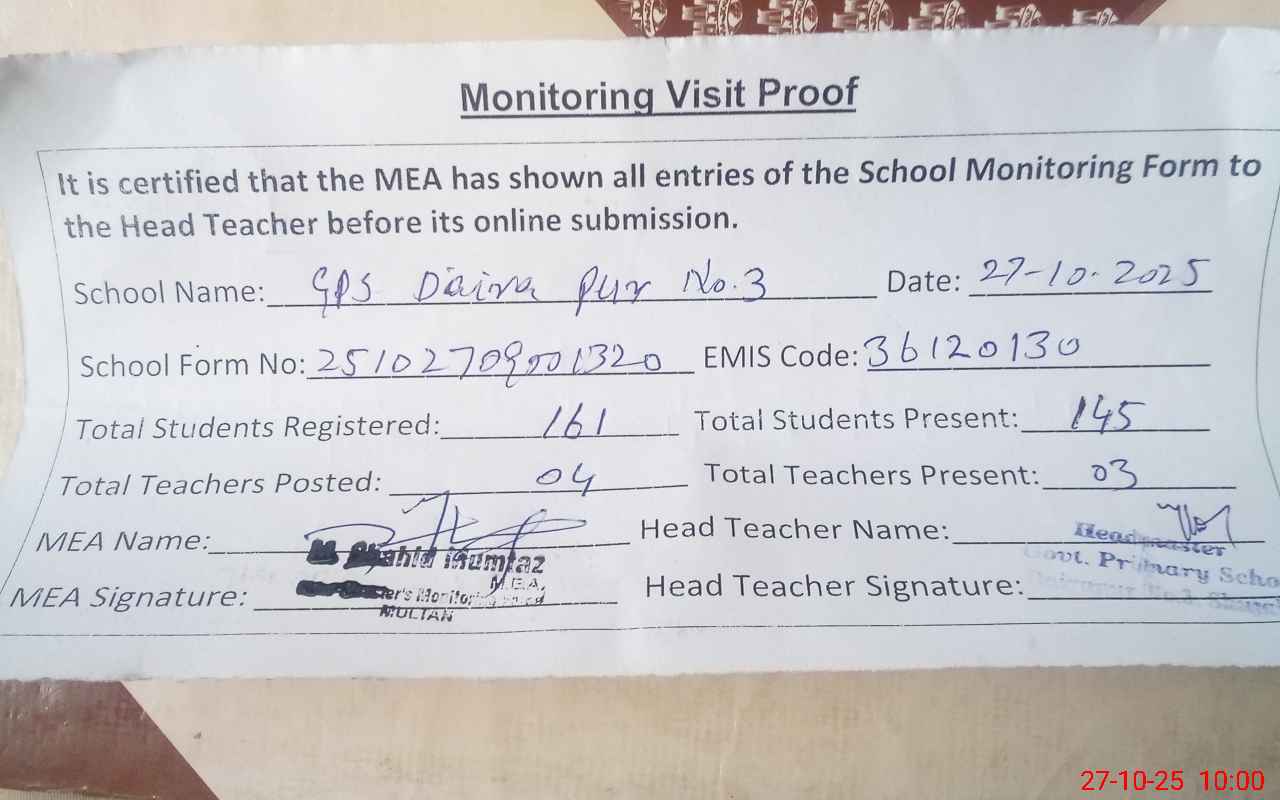 | EMIS Code: 36120130 | Name of School: GPS DAIRA PUR NO. 3 SHUJA ABAD | |||