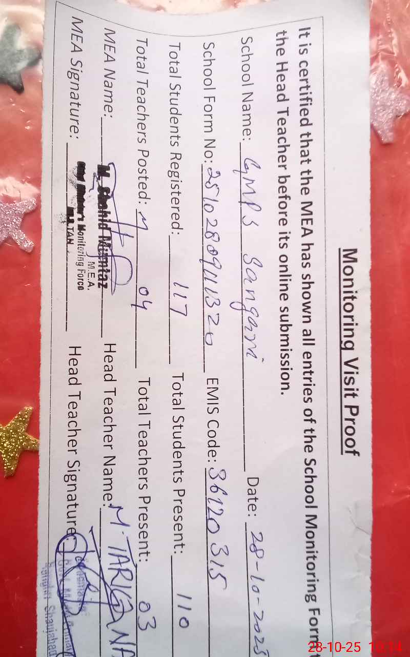 | EMIS Code: 36120315 | Name of School: GMPS SANGRI SHUJABAD DISTT. MULTAN | |||