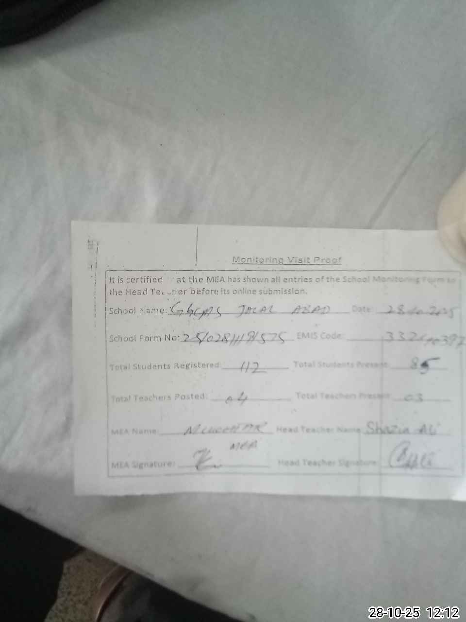 | Attendance Register | Head Teacher | MEA with School | Visit Proof |