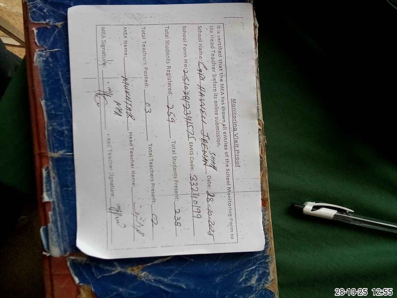 | Attendance Register | Head Teacher | MEA with School | Visit Proof |
