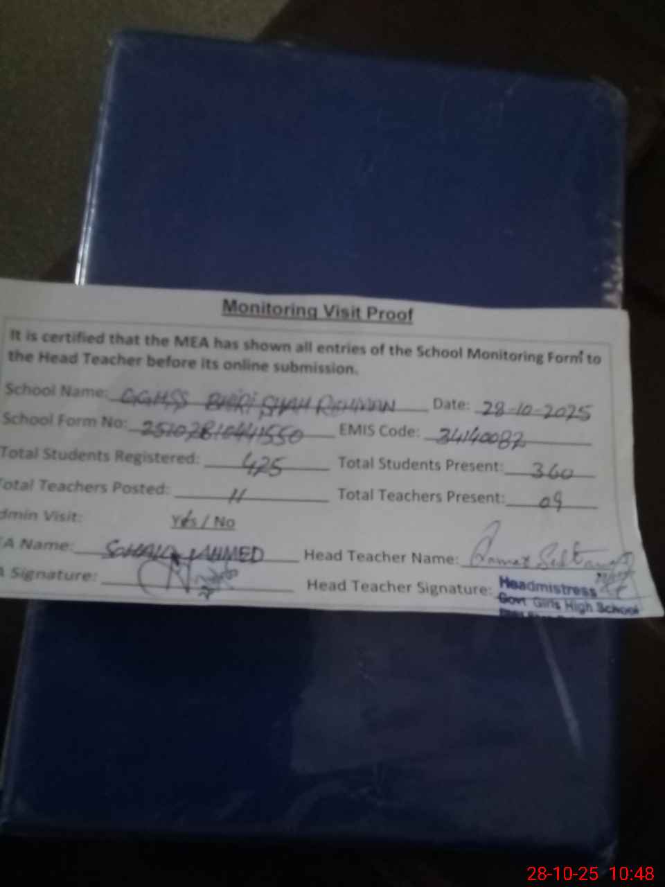 | Attendance Register | Head Teacher | MEA with School | Visit Proof |