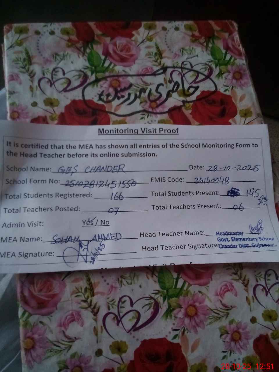 | Attendance Register | Head Teacher | MEA with School | Visit Proof |