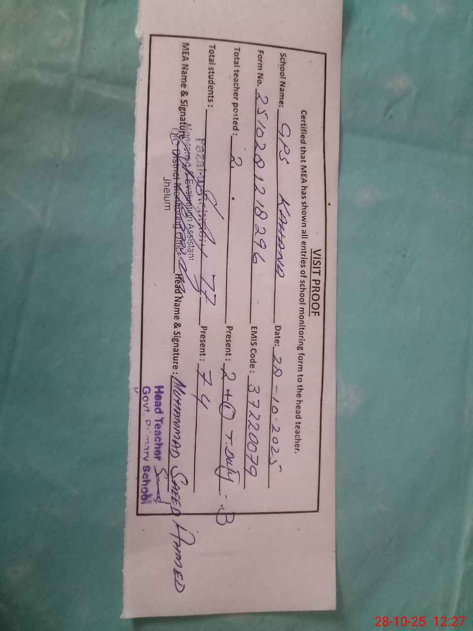 | Attendance Register | Head Teacher | MEA with School | Visit Proof |
