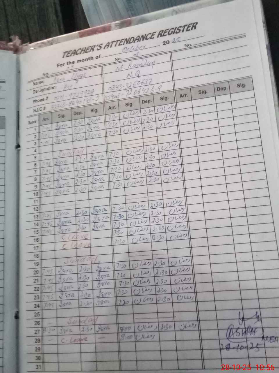 | CNIC | Full Name | Designation | R/C | Absence During Last Calender Month |