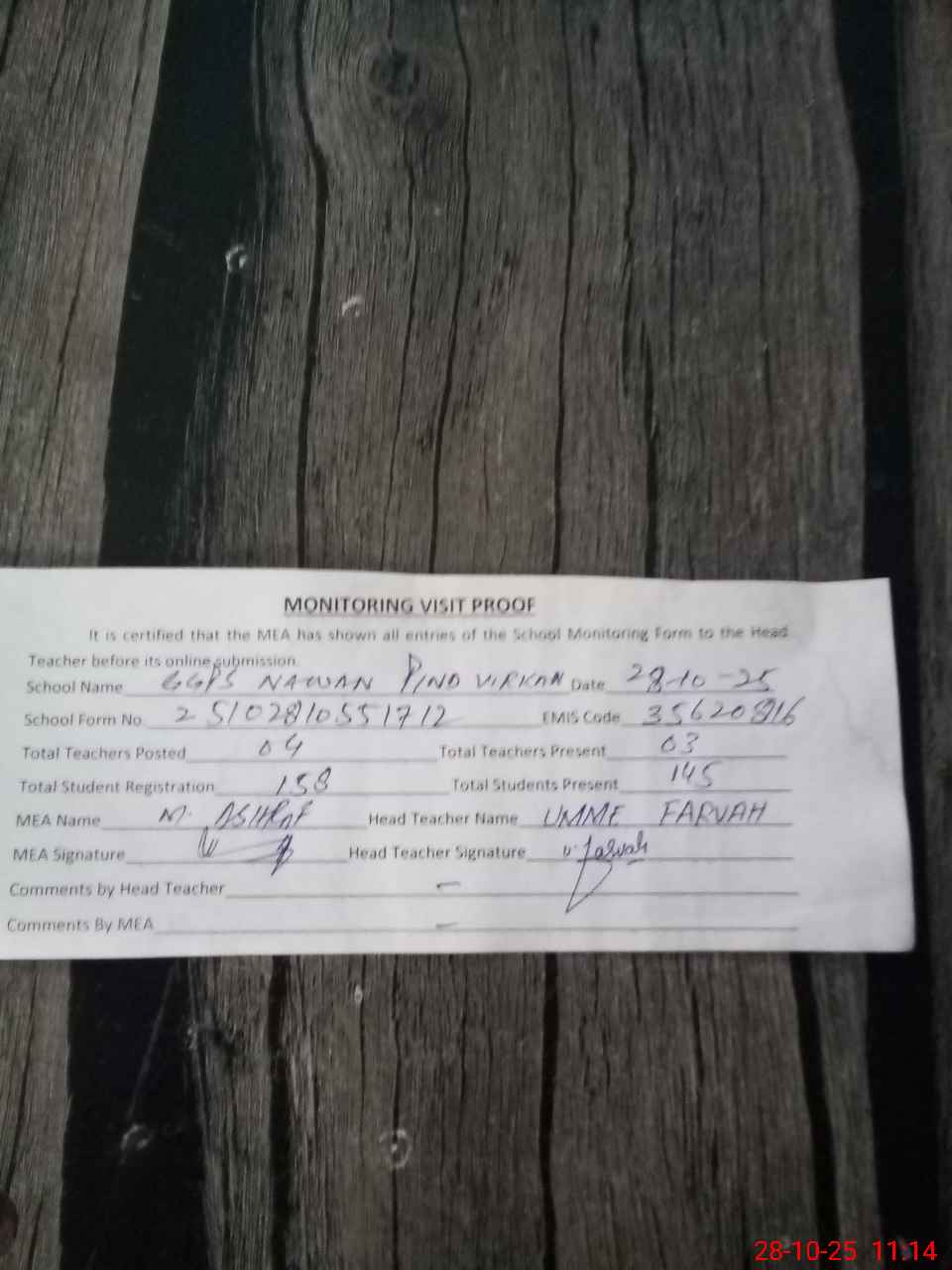| Attendance Register | Head Teacher | MEA with School | Visit Proof |