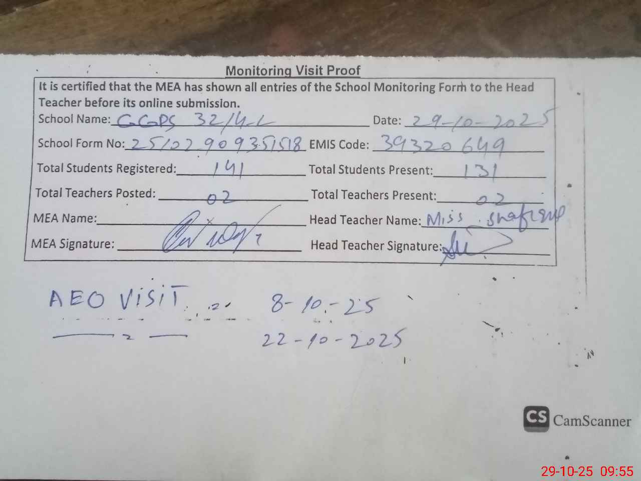 | Attendance Register | Head Teacher | MEA with School | Visit Proof |