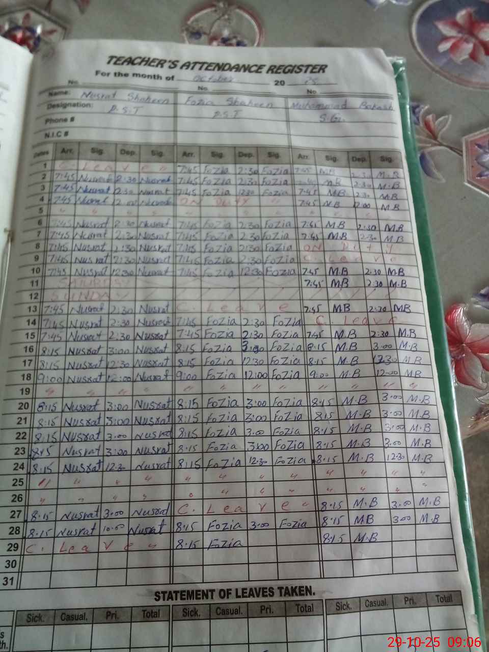 | Remarks (Use Separate Page if Required): School name Ggps maira mardwal Emis code 38240664 Sis students 48 Registered students 48 Present students 44 Last visit AEO tehmina 23oct 2025 No absent teacher One teacher on leave | |||||